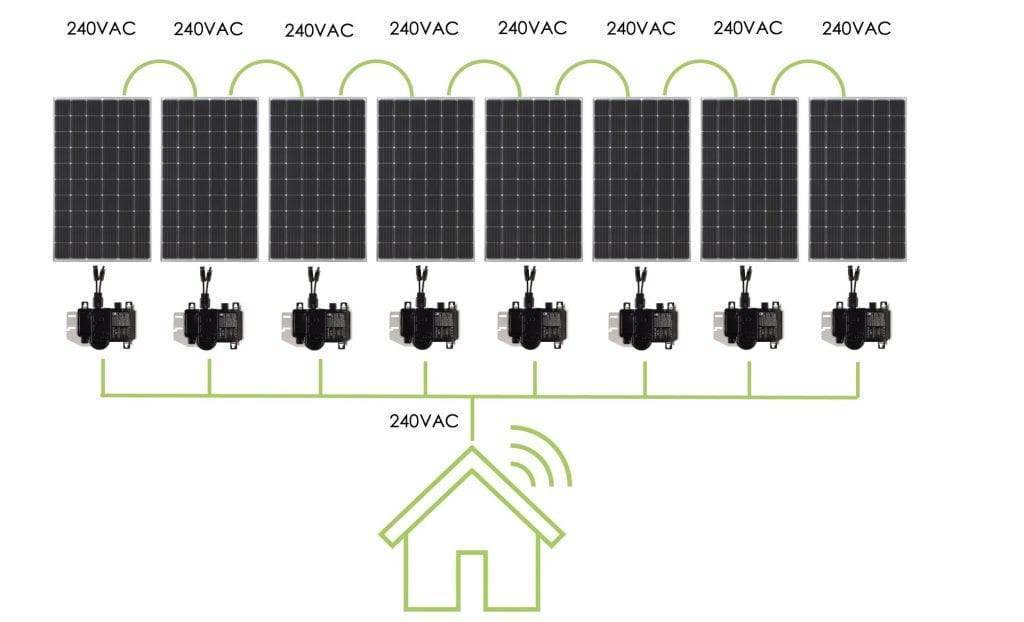 Klasik dizi inverter bağlantısında her bir panelin DC gerilimi toplanarak dizi gerilimi oluşurken, mikro inverterli bağlantıda her bir panel müstakil olarak bir mikro inverter ile 230 V AC gerilim çıkışı vermekte ve diğer panellerin çıkışları da ortak AC barada birleşmektedir. Mikro inverterler çalışma yapıları gereği birbirleriyle sıfır geçiş noktasında senkron olabilmektedirler.
