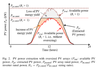 Panel sayısını, dolayısıyla panel seçimini etkileyen diğer bir konu eviricilerin boyutlandırılması veya DC/AC güç oranının belirlenmesidir. Evirici imalatçıları yaptıkları açıklamalarda ve teknik föylerde evirici gücünün %50 si oranında fazladan DC ile yüklenebileceğini ifade etmektedirler. Bu konuyu bir grafik üzerinden anlatmak uygun olacaktır: